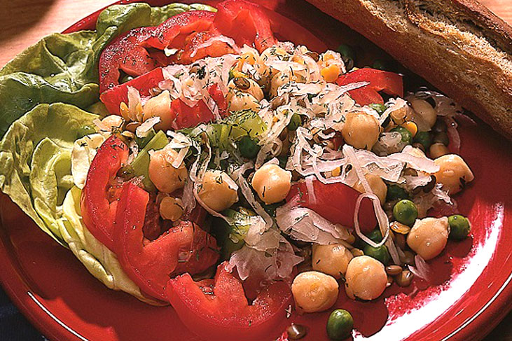 Combina los garbanzos, las lentejas, las arvejas, el apio, el pimiento y el jitomate.